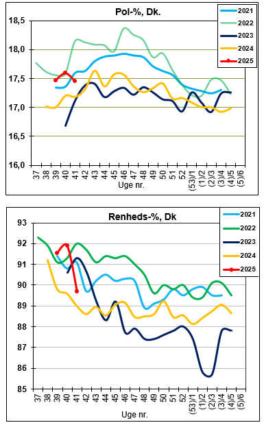 I nedenstående kurver vises pol-% og renheds-% for de sidste fem år.