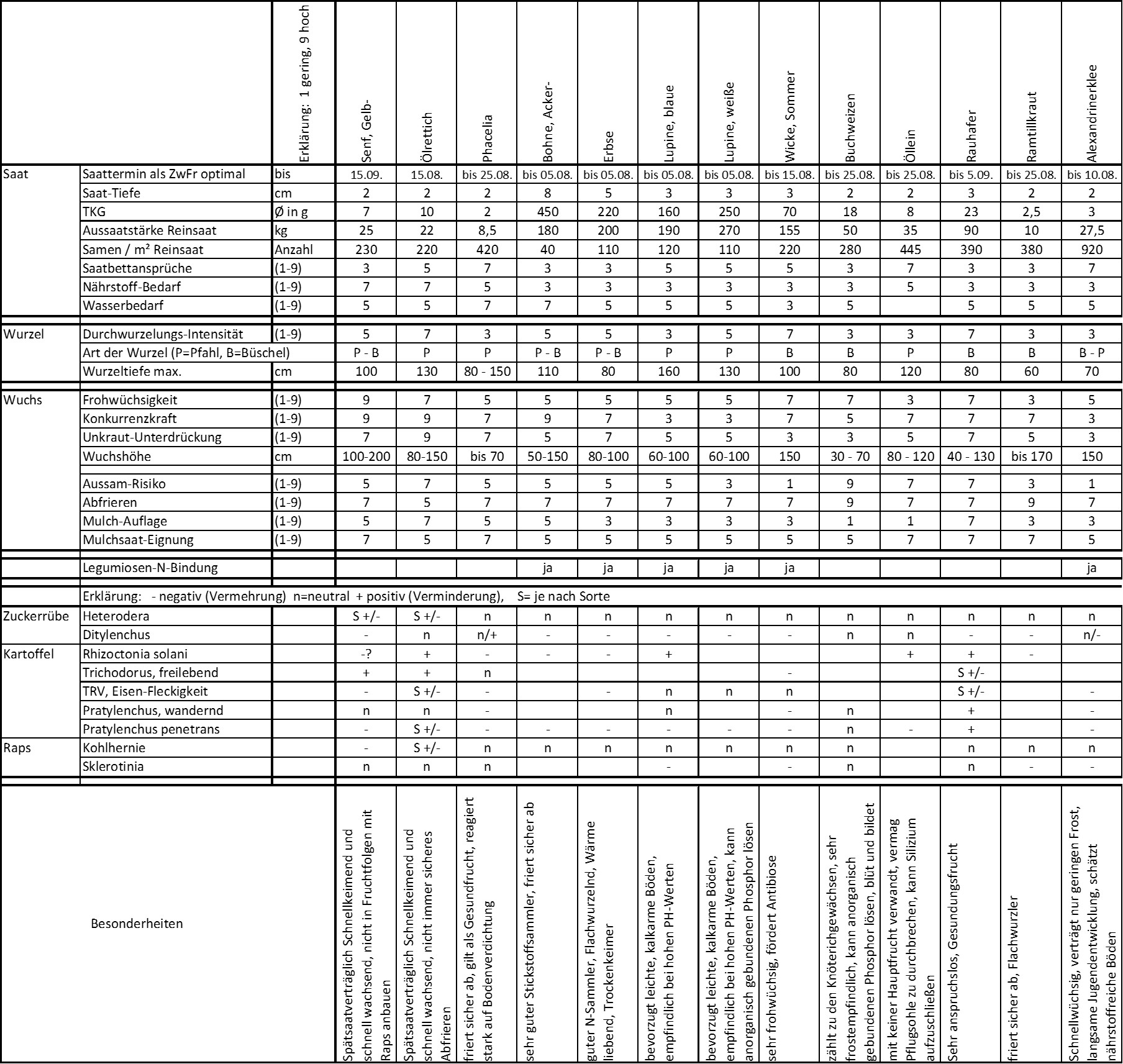 In dieser Tabelle sind die wichtigsten Eigenschaften einzelner Zwischenfruchtarten zusammengefasst.